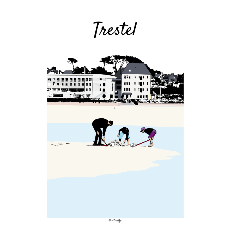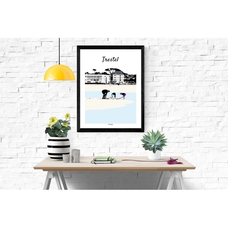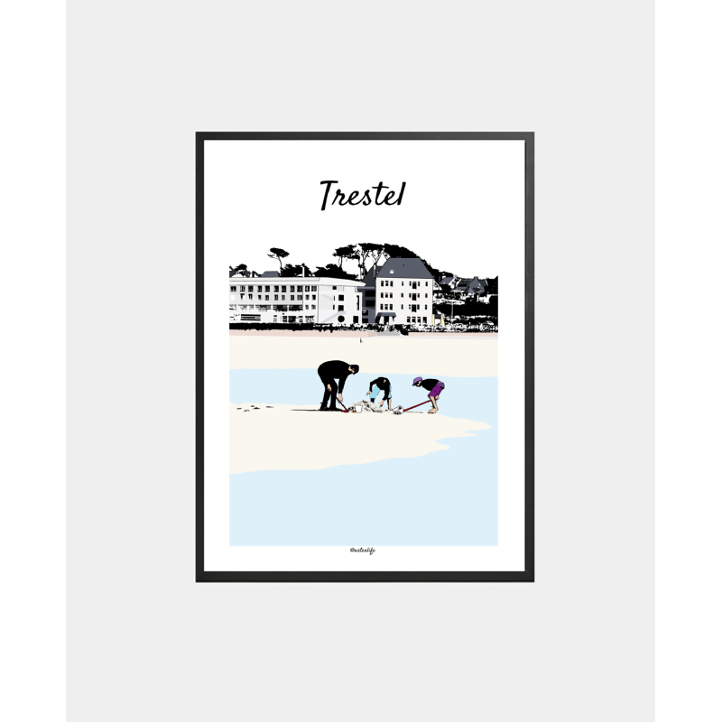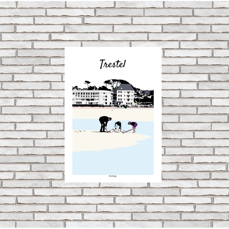 Cette affiche de la plage de Trestel à Trévou-Tréguignec illustre un moment de vie simple et chaleureux sur l’une des plages emblématiques de la Côte de Granit Rose.