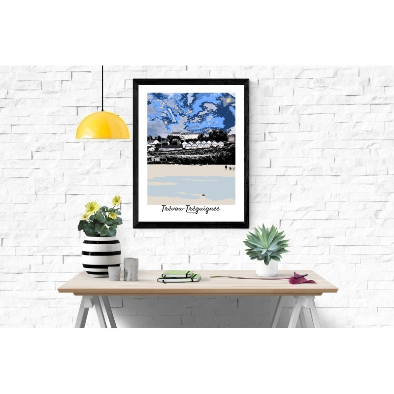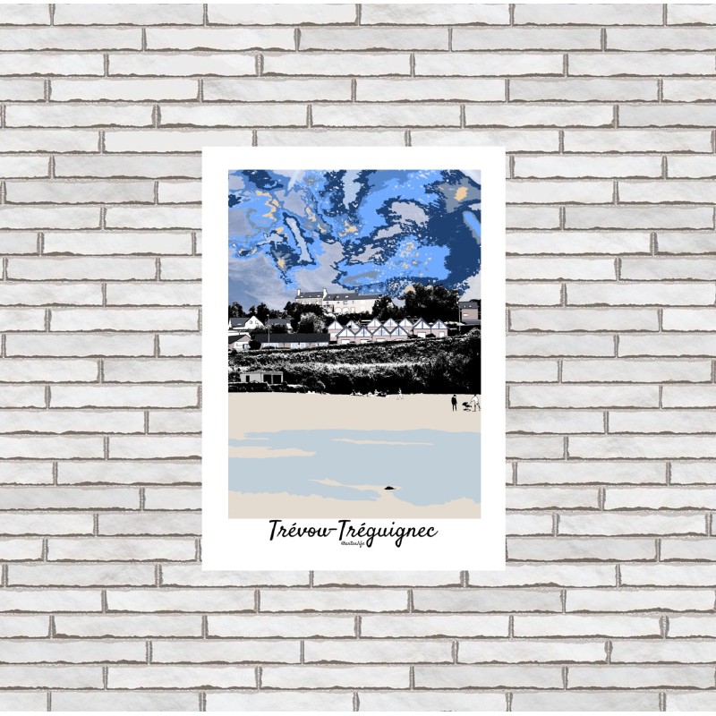 Cette affiche de la Plage de Trestel à Trévou-Tréguignec met en scène une large étendue de sable fin bordée par un bout de mer bretonne, dans une atmosphère paisible et lumineuse. Quelques promeneurs avancent doucement sur la plage, donnant à la scène une sensation de calme et d’espace.