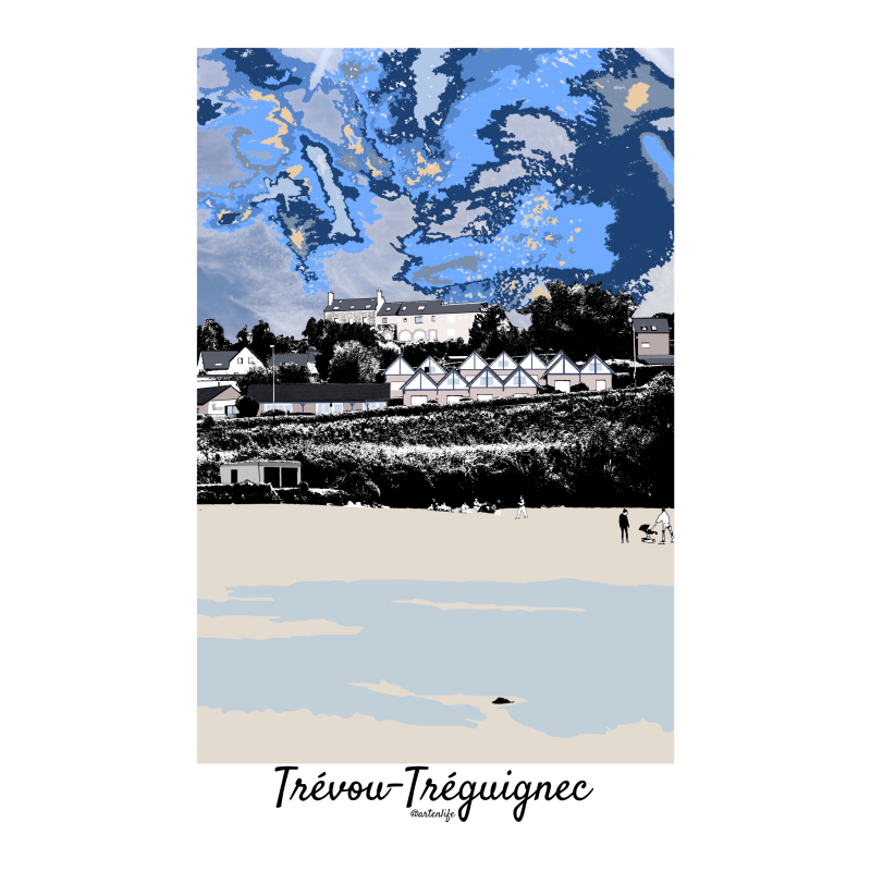 Détails particuliers : ciel pixelisé, contraste entre végétation sombre et plage claire, architecture bretonne en hauteur