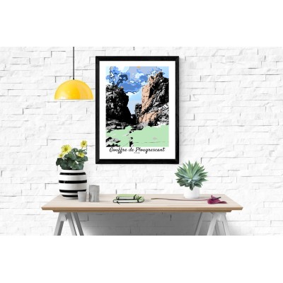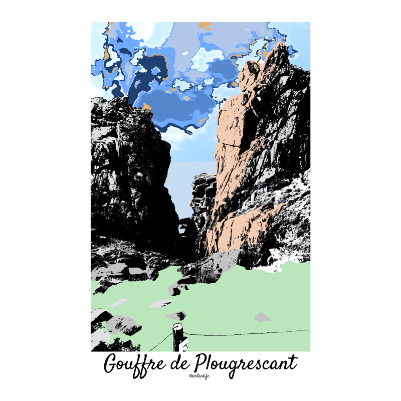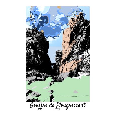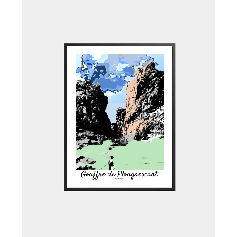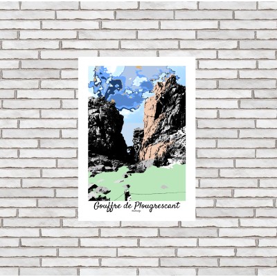 Cette affiche illustrée du Gouffre de Plougrescant, sur la Côte des Ajoncs d’Or dans les Côtes-d’Armor, met en scène la puissance brute de la nature bretonne. La mer bleu profond, coincée entre deux falaises de granit gris et rose orangé, crée une composition spectaculaire et hypnotique.
