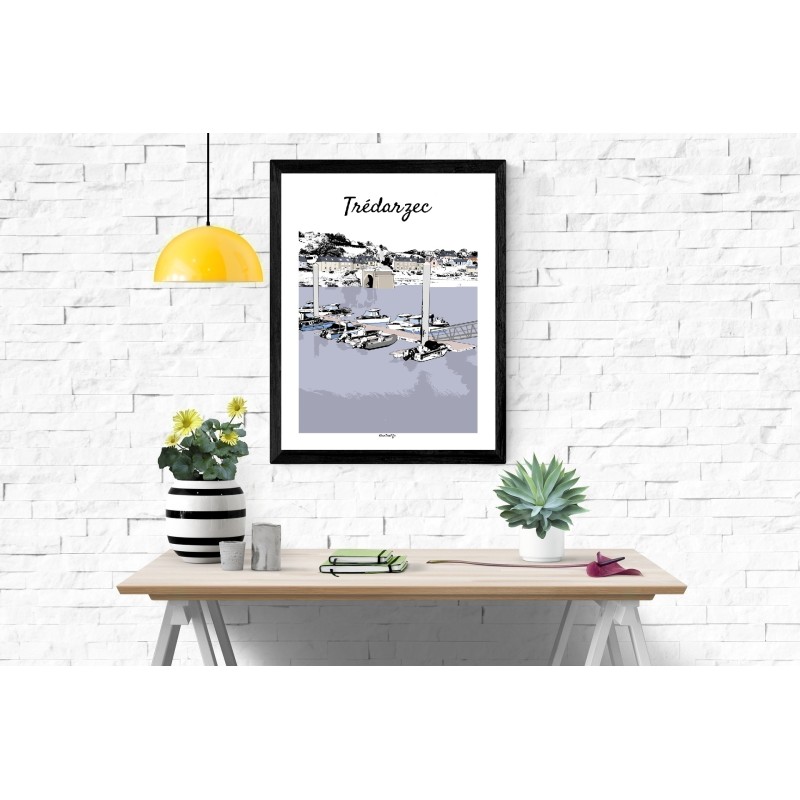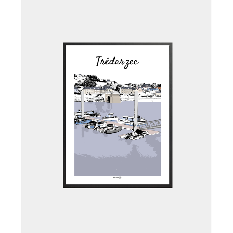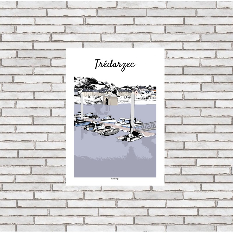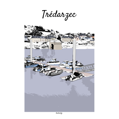 Cette affiche illustrée du port de Trédarzec, sur la Côte des Ajoncs d’Or dans les Côtes-d’Armor, offre une vue paisible et authentique de l’estuaire du Jaudy. La scène dévoile la rivière bleutée, le port de Tréguier et, sur l’autre rive, le vieux pont en pierre reliant les deux rives.