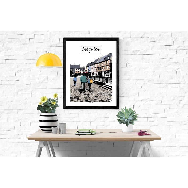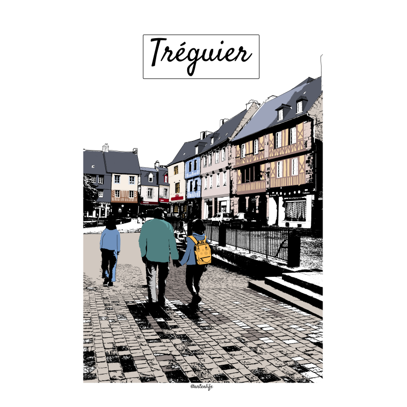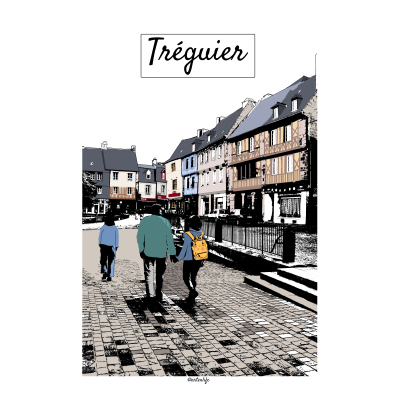 Le pavage de la place guide le regard vers une famille se promenant, apportant une touche de vie et de douceur quotidienne. Cette affiche décorative bretonne évoque la convivialité, le patrimoine et le plaisir simple de flâner dans les ruelles de Tréguier.